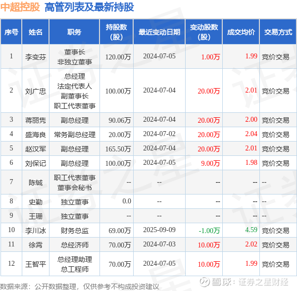 中超控股近半年内的董监高及核心技术人员增减持详情如下: