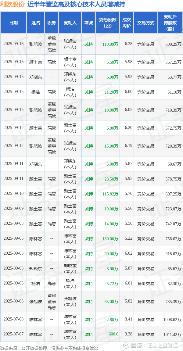 利欧股份近半年内的董监高及核心技术人员增减持详情如下: