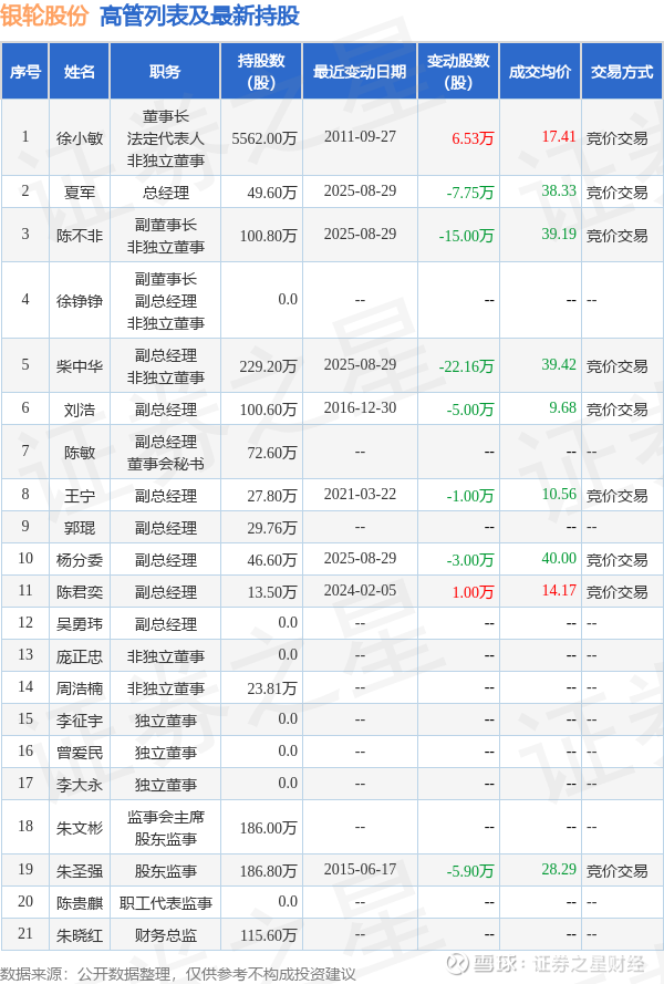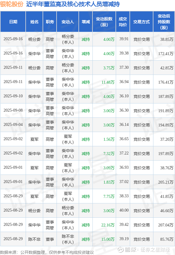 证券之星消息,根据9月17日市场公开信息、上市公司公告及交易所披露数据整理,银轮股份(002126)最新董监高及相关人员股份变动情况:2025年9月16日公司董事,高管柴中华、高管杨分委共减持公司股份8.0万股,占公司总股本为0.0096%。变动期间公司股价上涨10.01%,9月16日当日收盘报39.91元。
