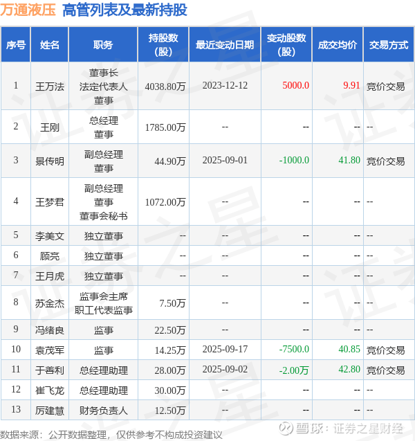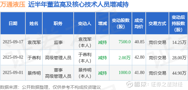 万通液压近半年内的董监高及核心技术人员增减持详情如下: