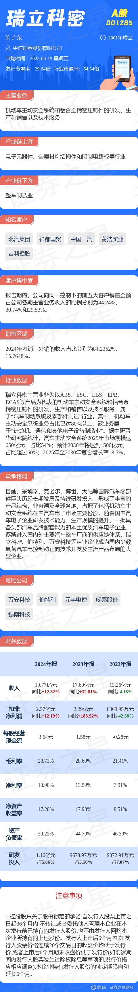 证券之星消息,瑞立科密9月19日网上申购,申购代码为001285,中签号公布日期为9月23日。该股概况请见下图: