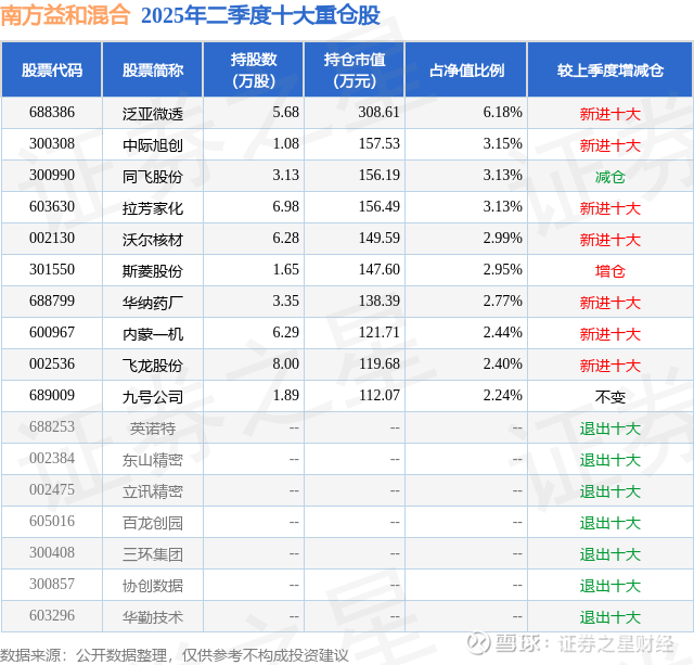 根据2025基金半年报公募基金重仓股数据,重仓该股的公募基金共1家,其中持有数量最多的公募基金为南方基金的南方益和混合。南方益和混合目前规模为0.5亿元,最新净值2.0494(9月17日),较上一交易日上涨0.72%,近一年上涨56.72%。该公募基金现任基金经理为邹寅隆。