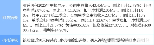 2025年8月28日,中邮证券研究员付秉正发布了对亚普股份的研报《海外业务持续发力,25H1高质量增长》,该研报对亚普股份给出“买入”评级。研报中预计2025-2027年营收为89.25/98.90/109.02亿元(原值86.73/96.47/102.39亿元),归母净利润为5.57/6.21/7.12亿元(原值5.37/6.09/6.72亿元),EPS为1.09/1.21/1.39元/股(原值1.05/1.19/1.31元/股),当前股价对应PE为21.7/19.4/17.0倍。维持“买入”评级。证券之星数据中心根据近三年发布的研报数据计算,该研报作者对此股的盈利预测准确度为73.3%。