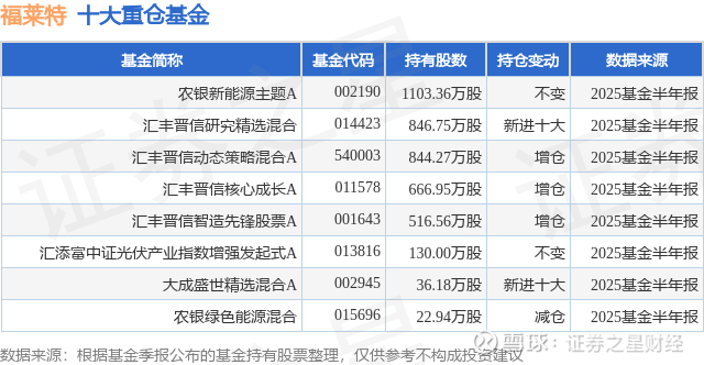 根据2025基金半年报公募基金重仓股数据,重仓该股的公募基金共8家,其中持有数量最多的公募基金为农银汇理基金的农银新能源主题A。农银新能源主题A目前规模为76.16亿元,最新净值2.7973(9月17日),较上一交易日上涨1.56%,近一年上涨46.63%。该公募基金现任基金经理为邢军亮 左腾飞。邢军亮在任的基金产品包括:农银行业轮动混合A,管理时间为2021年7月15日至今,期间收益率为44.51%;农银绿色能源混合,管理时间为2022年8月2日至今,期间收益率为-12.81%。