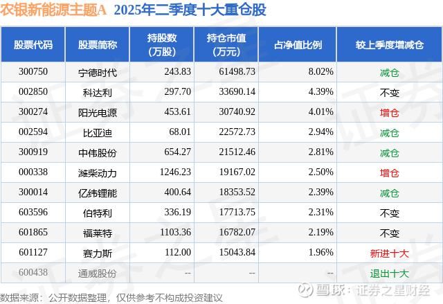 农银新能源主题A的前十大重仓股如下: