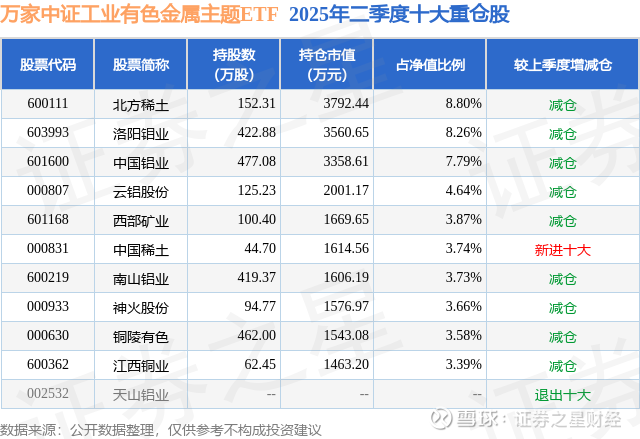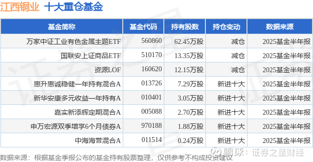 根据2025基金半年报公募基金重仓股数据,重仓该股的公募基金共8家,其中持有数量最多的公募基金为万家基金的万家中证工业有色金属主题ETF。万家中证工业有色金属主题ETF目前规模为4.31亿元,最新净值1.2556(9月17日),较上一交易日上涨0.58%,近一年上涨8.75%。该公募基金现任基金经理为贺方舟。贺方舟在任的基金产品包括:万家沪深300成长ETF,管理时间为2024年4月15日至今,期间收益率为44.52%;万家上证50ETF,管理时间为2024年4月15日至今,期间收益率为30.83%;万家180指数A,管理时间为2024年4月15日至今,期间收益率为32.43%;万家中证半导体材料设备主题ETF,管理时间为2024年7月24日至今,期间收益率为46.07%。
