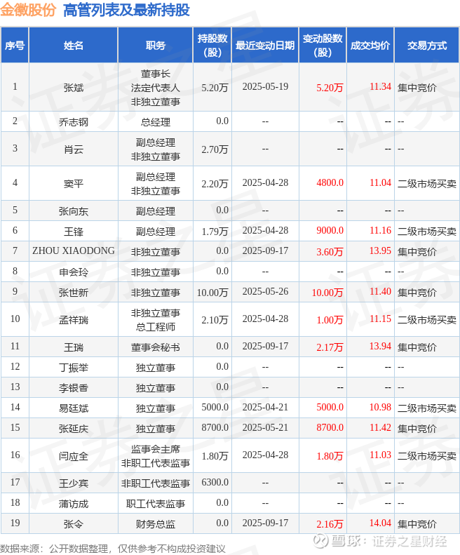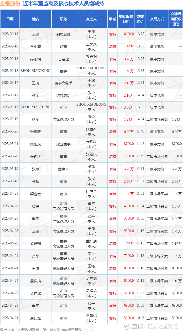 金徽股份近半年内的董监高及核心技术人员增减持详情如下: