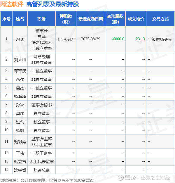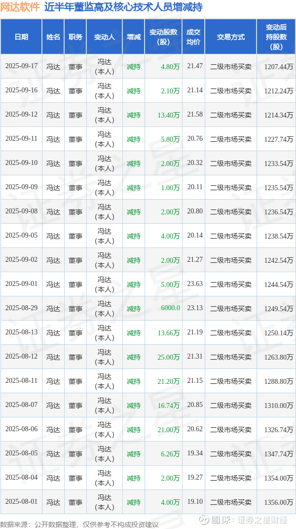 网达软件近半年内的董监高及核心技术人员增减持详情如下: