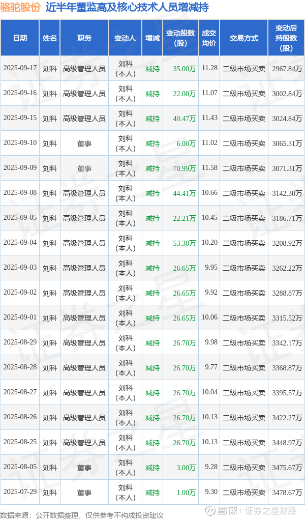 骆驼股份近半年内的董监高及核心技术人员增减持详情如下: