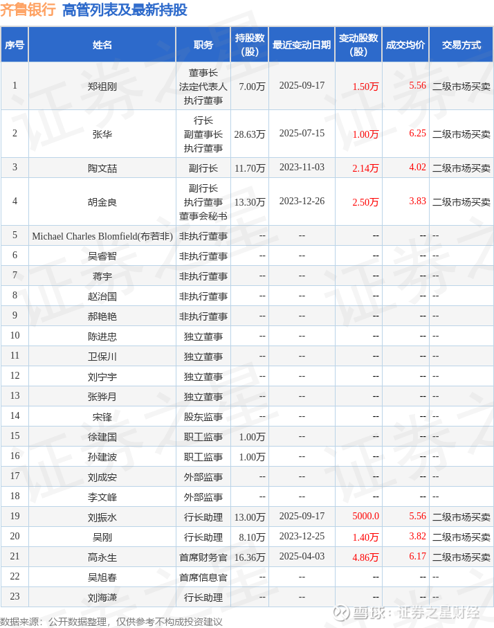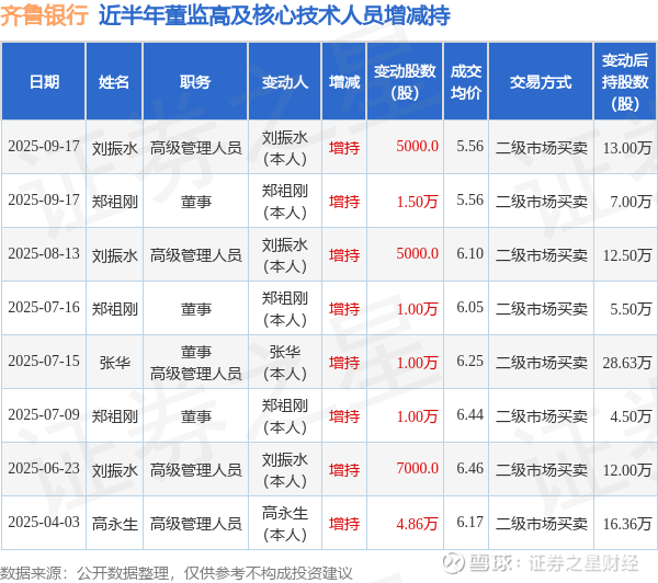 齐鲁银行近半年内的董监高及核心技术人员增减持详情如下:
