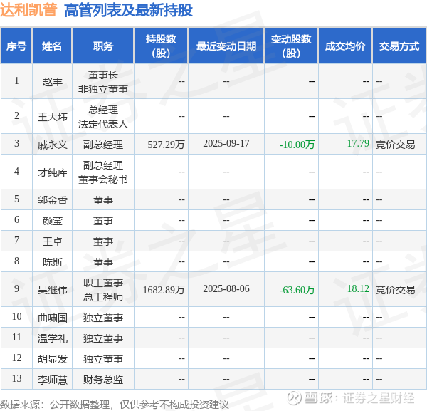达利凯普近半年内的董监高及核心技术人员增减持详情如下: