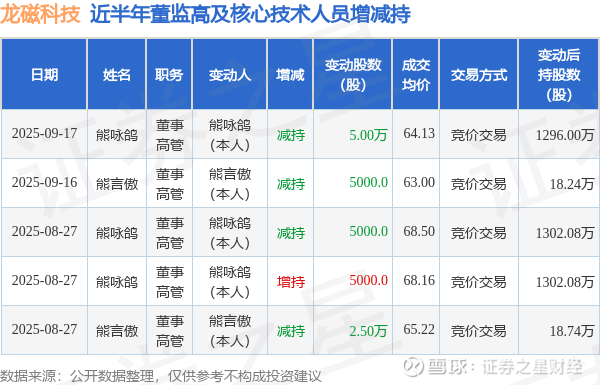 证券之星消息,根据9月18日市场公开信息、上市公司公告及交易所披露数据整理,龙磁科技(300835)最新董监高及相关人员股份变动情况:2025年9月17日公司董事,高管熊咏鸽共减持公司股份5.0万股,占公司总股本为0.0419%。变动期间公司股价上涨3.38%,9月17日当日收盘报64.79元。