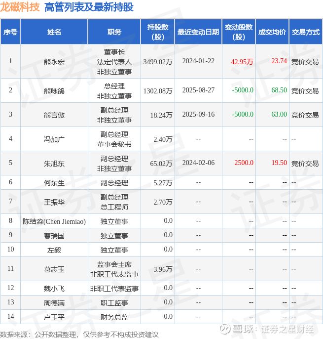 龙磁科技的高管列表及最新持股情况如下: