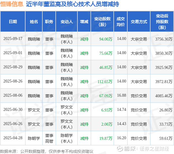 恒锋信息近半年内的董监高及核心技术人员增减持详情如下: