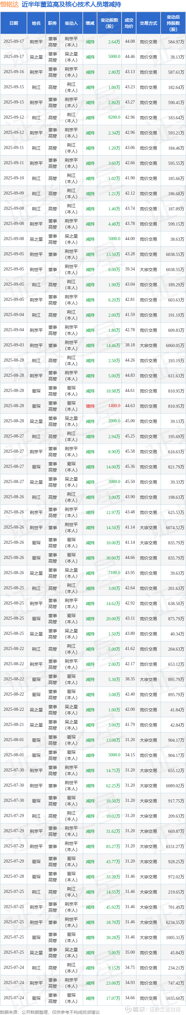 恒铭达近半年内的董监高及核心技术人员增减持详情如下: