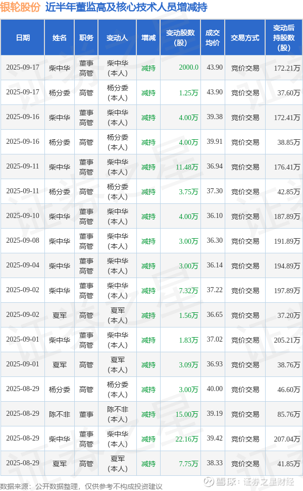 证券之星消息,根据9月18日市场公开信息、上市公司公告及交易所披露数据整理,银轮股份(002126)最新董监高及相关人员股份变动情况:2025年9月17日公司董事,高管柴中华、高管杨分委共减持公司股份1.45万股,占公司总股本为0.0017%。变动期间公司股价上涨10.0%,9月17日当日收盘报43.9元。
