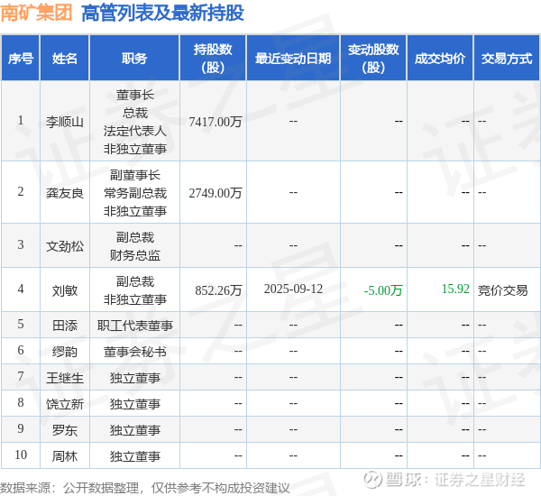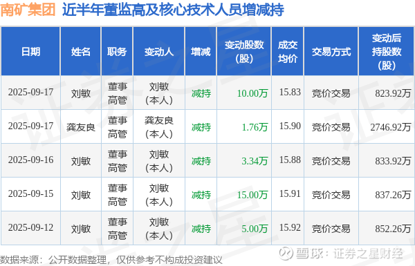 证券之星消息,根据9月18日市场公开信息、上市公司公告及交易所披露数据整理,南矿集团(001360)最新董监高及相关人员股份变动情况:2025年9月17日公司董事,高管龚友良、董事,高管刘敏共减持公司股份11.76万股,占公司总股本为0.0576%。变动期间公司股价下跌0.38%,9月17日当日收盘报15.85元。
