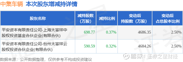 证券之星消息,9月18日中集车辆发布公告《中集车辆:关于持股5%以上股东减持计划实施完毕暨减持后持股比例低于5%的公告》,其股东平安资本有限责任公司-上海太富祥中股权投资基金合伙企业(有限合伙)、平安资本有限责任公司-台州太富祥云股权投资合伙企业(有限合伙)于2025年9月1日至2025年9月17日间合计减持1289.36万股,占公司目前总股本的0.688%,变动期间该股股价上涨1.98%,截止9月17日收盘报9.28元。