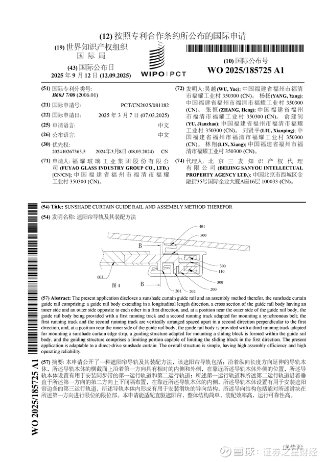 证券之星消息,根据企查查数据显示福耀玻璃(600660)公布了一项国际专利申请,专利名为“遮阳帘导轨及其装配方法”,专利申请号为PCT/CN2025/081182,国际公布日为2025年9月11日。