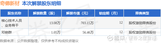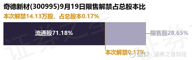 证券之星消息,根据市场公开信息整理,奇德新材(300995)于9月19日将有14.13万股限售股份解禁,为公司股权激励限售股份,占公司总股本0.17%。(本次数据根据历史公告整理得出,实际情况以上市公司最新公告为准)本次解禁后,公司还有2411.39万股限售股份,占总股本28.65%。具体如下图所示: