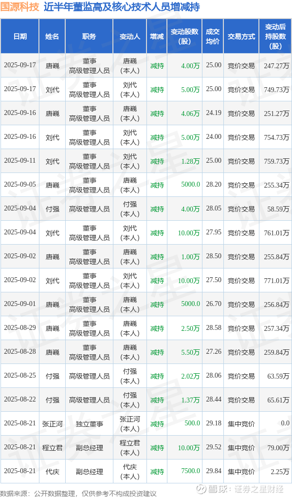 国源科技近半年内的董监高及核心技术人员增减持详情如下: