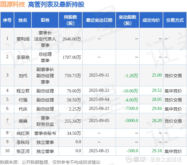 国源科技的高管列表及最新持股情况如下: