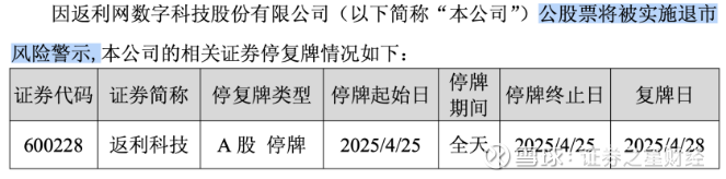 由于公司2024年净利润为负值且营业收入低于3亿元,公司股票于今年4月28日起被实施退市风险警示,股票简称由“返利科技”变更为“*ST返利”。