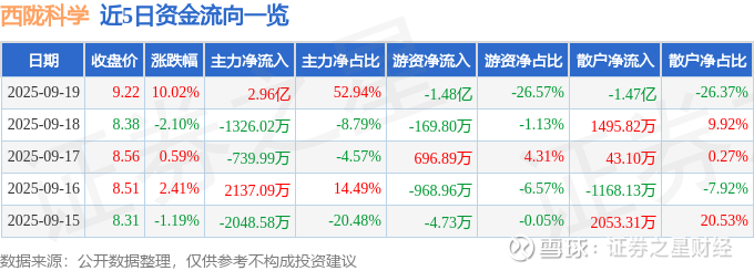9月19日的资金流向数据方面,主力资金净流入2.96亿元,占总成交额52.94%,游资资金净流出1.48亿元,占总成交额26.57%,散户资金净流出1.47亿元,占总成交额26.37%。