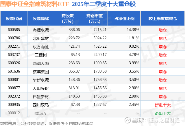 根据2025基金半年报公募基金重仓股数据,重仓该股的公募基金共4家,其中持有数量最多的公募基金为国泰基金的国泰中证全指建筑材料ETF。国泰中证全指建筑材料ETF目前规模为5.02亿元,最新净值0.6395(9月18日),较上一交易日下跌1.52%,近一年上涨39.02%。该公募基金现任基金经理为黄岳。黄岳在任的基金产品包括:国泰中证医疗ETF,管理时间为2021年2月5日至今,期间收益率为-53.38%;国泰中证生物医药ETF,管理时间为2021年2月5日至今,期间收益率为-39.77%;国泰中证科创创业50ETF,管理时间为2021年6月29日至今,期间收益率为-4.95%。