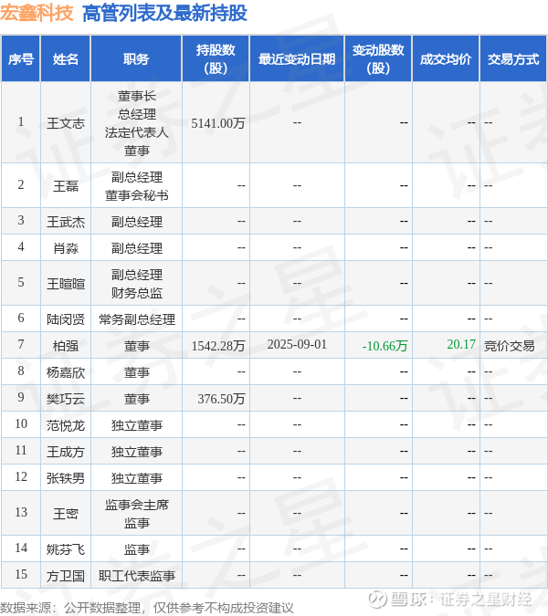 证券之星消息,根据9月19日市场公开信息、上市公司公告及交易所披露数据整理,宏鑫科技(301539)最新董监高及相关人员股份变动情况:2025年9月18日公司董事柏强共减持公司股份22.26万股,占公司总股本为0.1504%。变动期间公司股价下跌3.97%,9月18日当日收盘报19.81元。