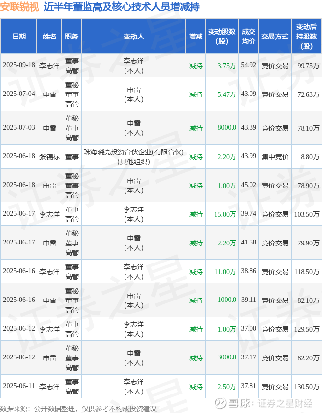 安联锐视近半年内的董监高及核心技术人员增减持详情如下: