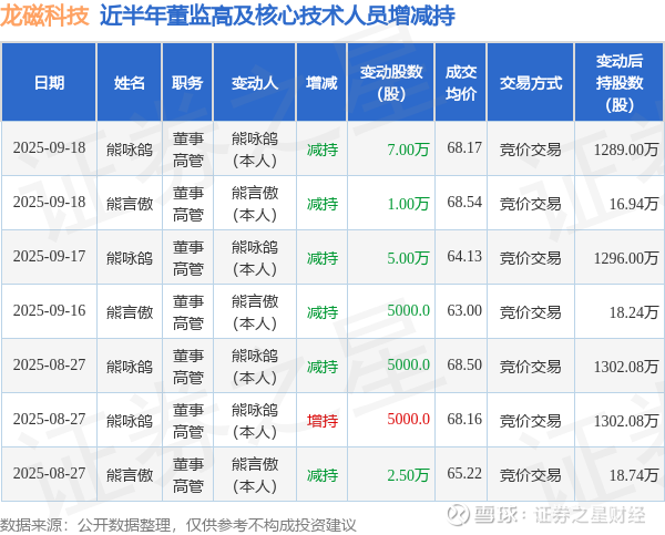 证券之星消息,根据9月19日市场公开信息、上市公司公告及交易所披露数据整理,龙磁科技(300835)最新董监高及相关人员股份变动情况:2025年9月18日公司董事,高管熊咏鸽、董事,高管熊言傲共减持公司股份8.0万股,占公司总股本为0.067%。变动期间公司股价上涨1.56%,9月18日当日收盘报65.8元。