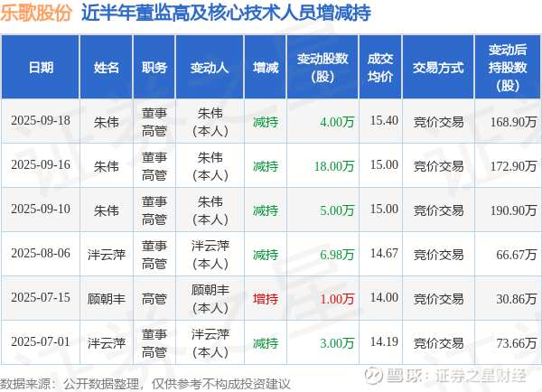 证券之星消息,根据9月19日市场公开信息、上市公司公告及交易所披露数据整理,乐歌股份(300729)最新董监高及相关人员股份变动情况:2025年9月18日公司董事,高管朱伟共减持公司股份4.0万股,占公司总股本为0.0117%。变动期间公司股价上涨2.63%,9月18日当日收盘报15.6元。
