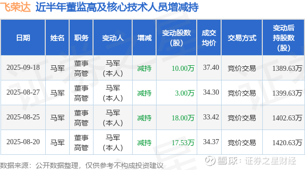 证券之星消息,根据9月19日市场公开信息、上市公司公告及交易所披露数据整理,飞荣达(300602)最新董监高及相关人员股份变动情况:2025年9月18日公司董事,高管马军共减持公司股份10.0万股,占公司总股本为0.0172%。变动期间公司股价上涨10.19%,9月18日当日收盘报35.69元。