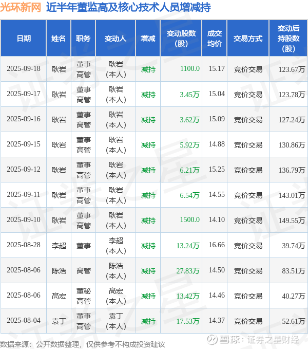 证券之星消息,根据9月19日市场公开信息、上市公司公告及交易所披露数据整理,光环新网(300383)最新董监高及相关人员股份变动情况:2025年9月18日公司董事,高管耿岩共减持公司股份1100.0股,占公司总股本为0.0001%。变动期间公司股价下跌1.66%,9月18日当日收盘报14.8元。