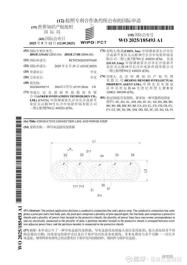 证券之星消息,根据企查查数据显示安克创新(300866)公布了一项国际专利申请,专利名为“一种导电连接线及排插”,专利申请号为PCT/CN2025/079109,国际公布日为2025年9月11日。