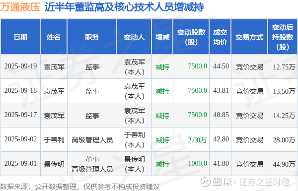 万通液压近半年内的董监高及核心技术人员增减持详情如下: