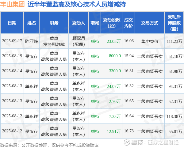 丰山集团近半年内的董监高及核心技术人员增减持详情如下: