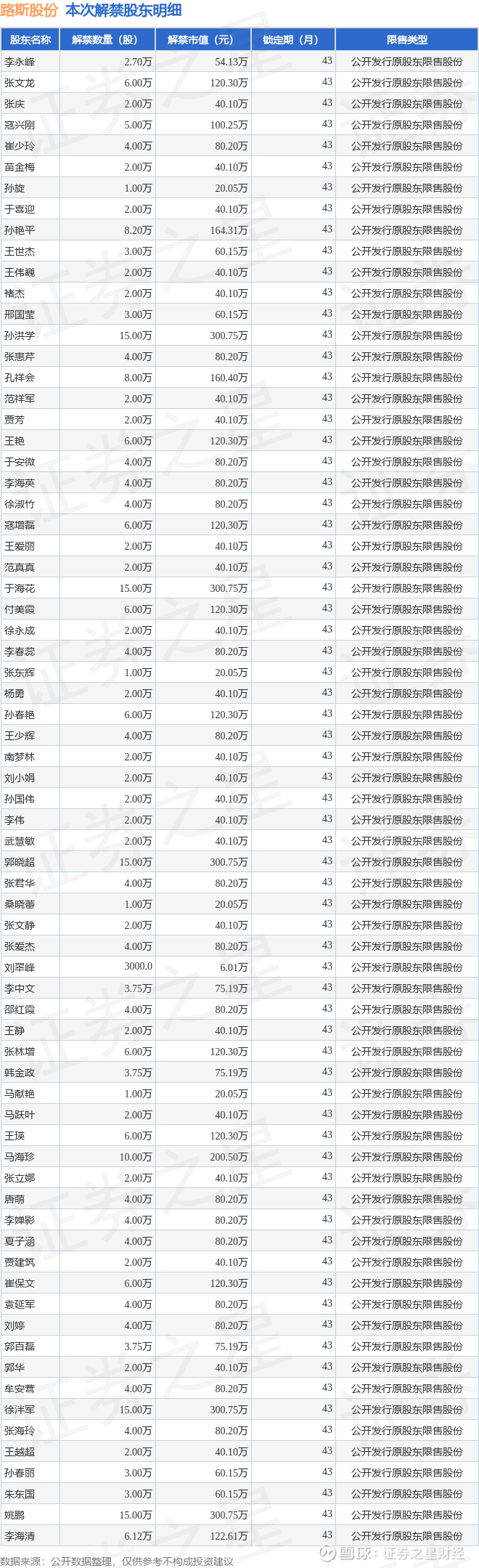 证券之星消息,根据市场公开信息整理,路斯股份(832419)于9月22日将有304.56万股限售股份解禁,为公司公开发行原股东限售股份,占公司总股本2.95%。(本次数据根据历史公告整理得出,实际情况以上市公司最新公告为准)本次解禁后,公司还有666.03万股限售股份,占总股本6.45%。具体如下图所示: