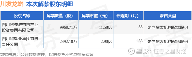证券之星消息,根据市场公开信息整理,川发龙蟒(002312)于9月22日将有1.25亿股限售股份解禁,为公司定向增发机构配售股份,占公司总股本6.6%。(本次数据根据历史公告整理得出,实际情况以上市公司最新公告为准)最近一年内,该股累计解禁45.65万股,占总股本的0.02%。本次解禁后,公司还有551.94万股限售股份,占总股本0.29%。具体如下图所示: