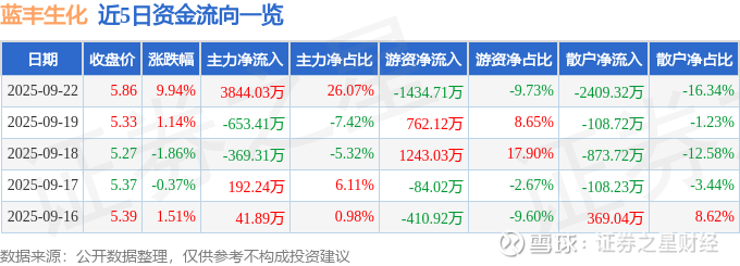 证券之星消息,蓝丰生化9月22日涨停收盘,收盘价5.86元。该股于9点58分涨停,未打开涨停,截止收盘封单资金为1.79亿元,占其流通市值11.52%。