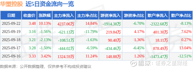 证券之星消息,华塑控股9月22日涨停收盘,收盘价3.48元。该股于13点59分涨停,8次打开涨停,截止收盘封单资金为1221.51万元,占其流通市值0.33%。