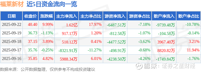 证券之星消息,福莱新材9月22日涨停收盘,收盘价40.4元。该股于13点48分涨停,未打开涨停,截止收盘封单资金为7151.62万元,占其流通市值0.64%。