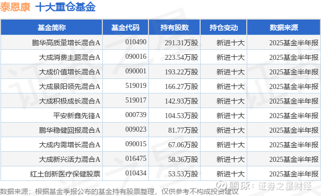 重仓泰恩康的前十大公募基金请见下表: