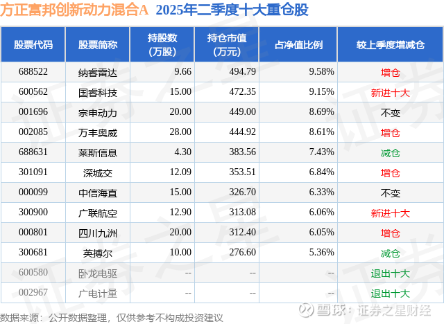 根据2025基金半年报公募基金重仓股数据,重仓该股的公募基金共1家,其中持有数量最多的公募基金为方正富邦基金的方正富邦创新动力混合A。方正富邦创新动力混合A目前规模为0.22亿元,最新净值0.6037(9月19日),较上一交易日下跌0.53%,近一年上涨48.88%。该公募基金现任基金经理为吴昊。吴昊在任的基金产品包括:方正富邦中证保险A,管理时间为2018年6月27日至今,期间收益率为55.59%;方正富邦深证100ETF,管理时间为2018年11月2日至今,期间收益率为106.66%;方正富邦红利精选混合A,管理时间为2019年5月24日至今,期间收益率为52.71%;方正富邦天恒混合A,管理时间为2019年9月19日至今,期间收益率为58.78%。