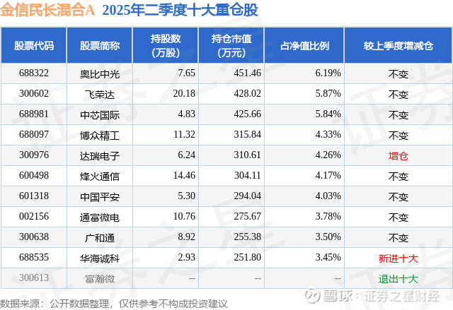 根据2025基金半年报公募基金重仓股数据,重仓该股的公募基金共1家,其中持有数量最多的公募基金为金信基金的金信民长混合A。金信民长混合A目前规模为0.36亿元,最新净值1.6637(9月19日),较上一交易日下跌0.24%,近一年上涨28.49%。该公募基金现任基金经理为谭智汨 刘尚。谭智汨在任的基金产品包括:金信多策略精选混合A,管理时间为2025年4月10日至今,期间收益率为55.19%;金信价值精选混合A,管理时间为2025年7月17日至今,期间收益率为8.58%;刘尚在任的基金产品包括:金信价值精选混合A,管理时间为2025年8月23日至今,期间收益率为-4.7%;