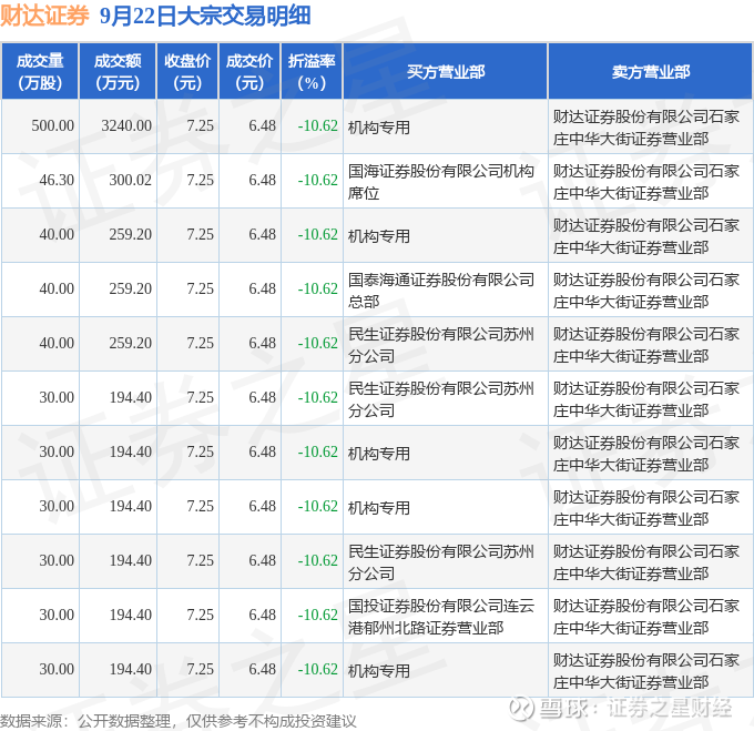 证券之星消息,9月22日财达证券发生大宗交易,交易数据如下: