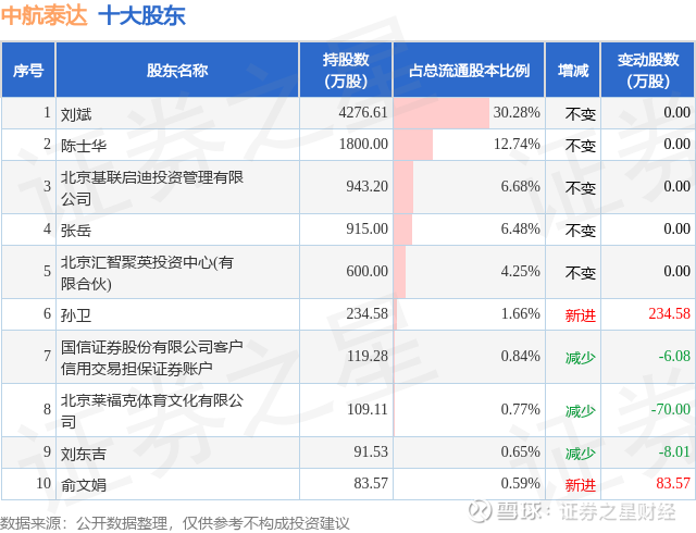 根据中航泰达2025年中报公布的十大股东详情如下: