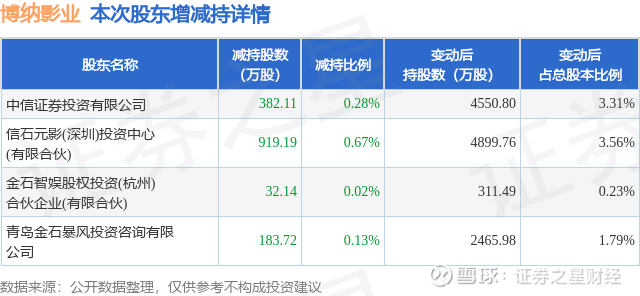 证券之星消息,9月22日博纳影业发布公告《博纳影业:关于持股5%以上股东权益变动触及1%整数倍的公告》,其股东中信证券投资有限公司、信石元影(深圳)投资中心(有限合伙)、金石智娱股权投资(杭州)合伙企业(有限合伙)、青岛金石暴风投资咨询有限公司于2025年9月19日合计减持1517.16万股,占公司目前总股本的1.1038%,变动期间该股股价上涨10.04%,截止9月19日收盘报6.25元。
