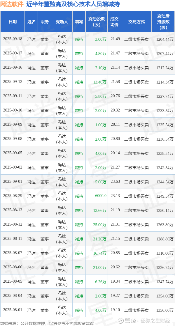 网达软件近半年内的董监高及核心技术人员增减持详情如下: